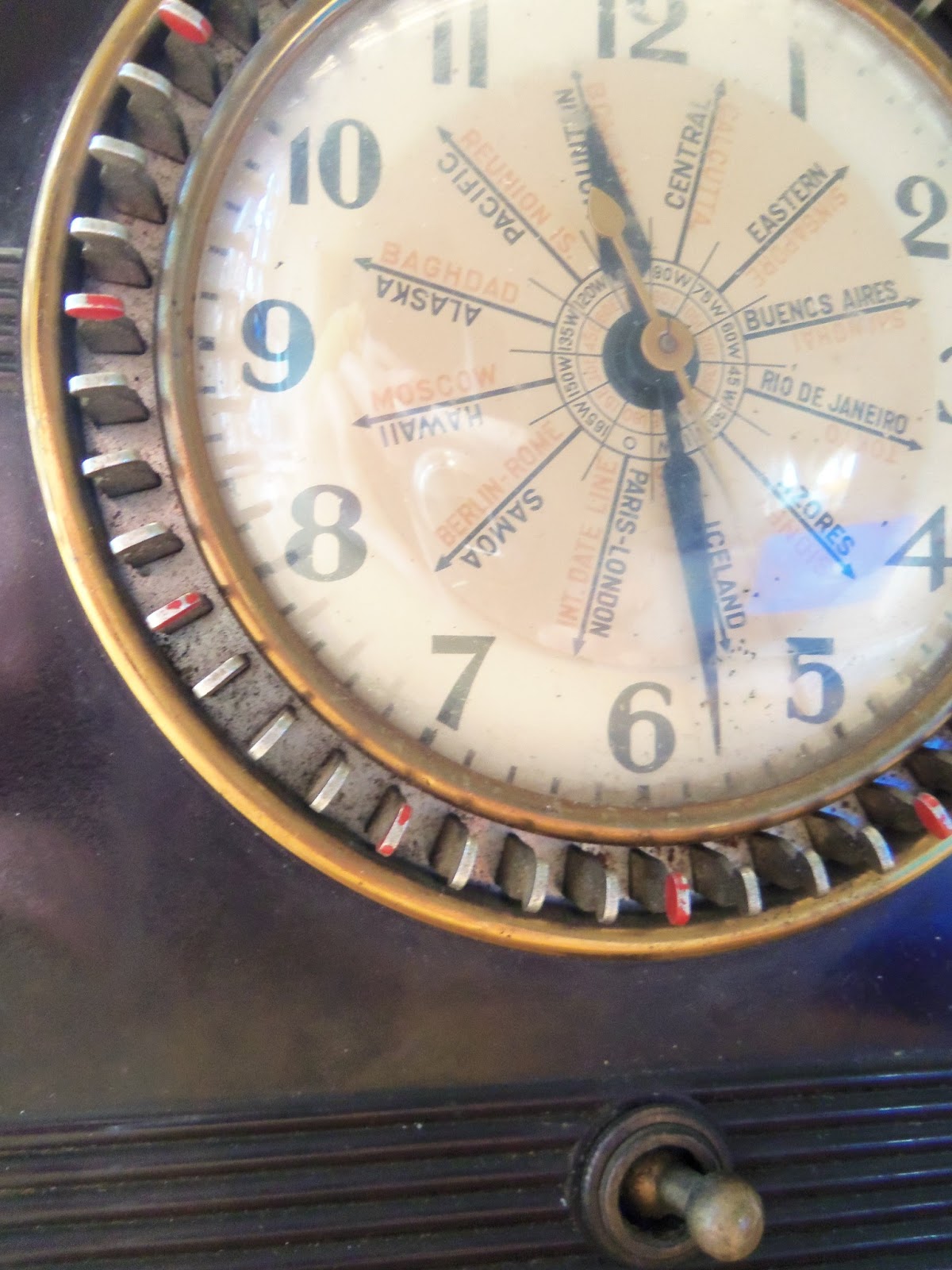 This clock is called the Radio Traveler, and dates to the mid part of the 1930s. It also has various time zones on the face of the clock, which I'm not quite sure how it relates to the functioning of the clock. But, it does look interesting. The clock is is great condition. The only thing being wrong with it is a missing knob for the dial that changes the time. I've had it running for several days, and it has kept steady time.